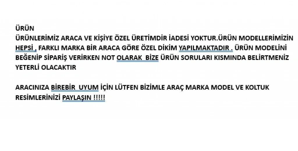 ARACINIZA BİREBİR  UYUM İÇİN LÜTFEN BİZİMLE ARAÇ MARKA MODEL VE KOLTUK RESİMLERİNİZİ PAYLAŞIN !!!!!