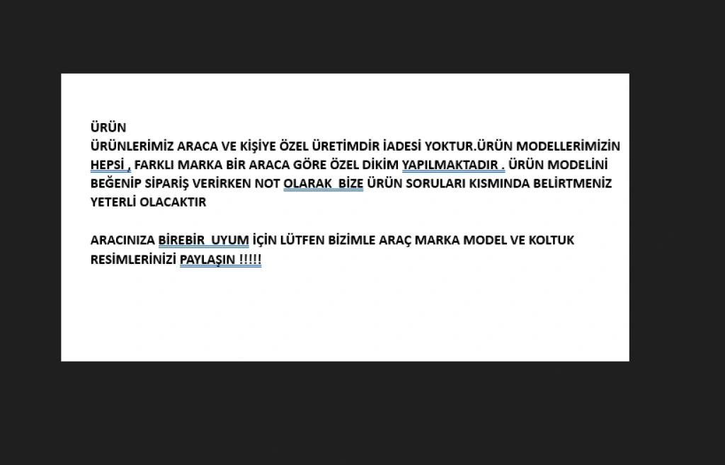 ARACINIZA BİREBİR  UYUM İÇİN LÜTFEN BİZİMLE ARAÇ MARKA MODEL VE KOLTUK RESİMLERİNİZİ PAYLAŞIN !!!!!